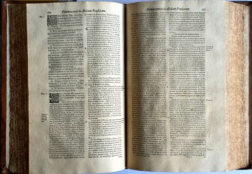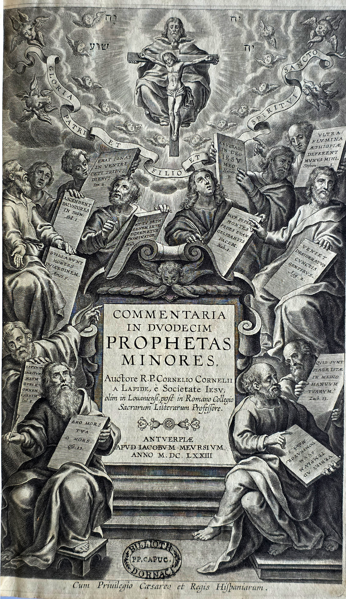 Erste Meursius-Ausgabe der berühmten Kommentare des Cornelius à Lapide (1567-1637) zu den biblischen Büchern der sogenannten "Kleinen Propheten" (prophetae minores), dem biblischen "Zwölfprophetenbuch" (Hosea, Joel, Amos, Obadja, Jona, Micha, Nahum, Habakuk, Zefanja, Haggai, Sacharja, Maleachi).