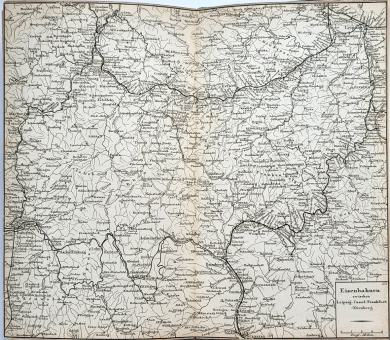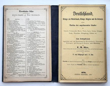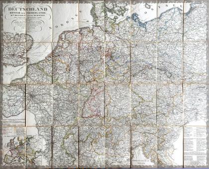 Eine der frühesten, wichtigsten Eisenbahn-Verbindungskarten von Mitteleuropa in sauberem Grenzkolorit in überaus feinem, detaillierten Stahlstich von dem Kartographen Franz Maximilian Diez (1767-1851) in Zusammenarbeit mit Friedrich von Stülpnagel (1786-1865), Johann Christoph Bär (1789-1848) und anderen: "Deutschland, Königr. der Niederlande, dem Königr. Belgien und die Schweiz nebst Theilen der angränzenden Ländern: nebst Theilen der angränzenden Länder bis Oxford, Portsmouth, Havre, Tours, Lyon, Genua, Bologna, Pesth, Warschau, Königsberg, Odense etc.; zum Reisegebrauch eingerichtet und mit Bezeichnung der Eisenbahnen, Chausseen, Eilwagen. und Extrapost-Routen …".