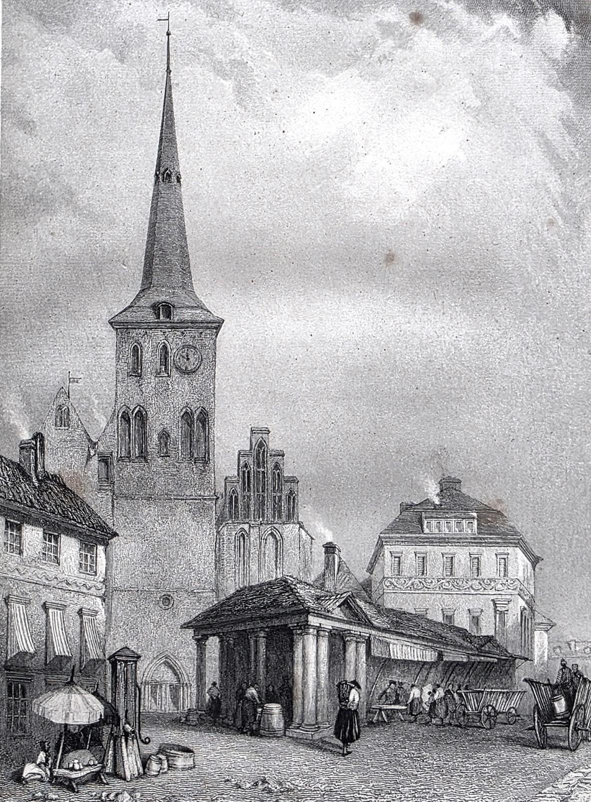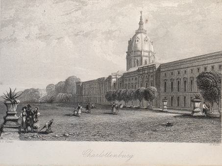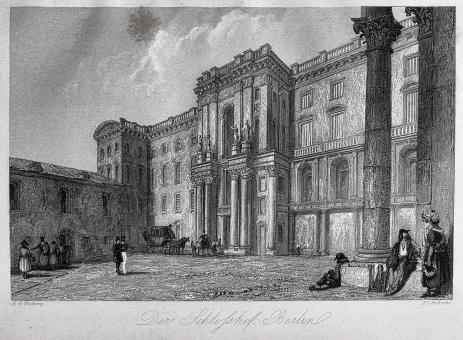 Die überaus feinen, sehr atmosphärischen Stiche wurden nach Vorlagen von Alfred G. Vickers (Thieme/Becker XXXIV, 328) in harte Stahlplatten graviert. Sie zeigen: Schloss Charlottenburg, das Neue Palais in Potsdam, den Schlosshof des Berliner Stadtschlosses, die Poststraße im Nikolaiviertel und die Nikolaikirche, ferner den neuen Packhof auf der Museumsinsel und die Oper mit Schinkels Neuer Wache "Unter den Linden". Der hervorragend detailliert gestochene Stadtplan (30 x 38 cm, dat. 1833) mit Miniaturansichten der Fassaden von Dom, Schlos, Schauspielhaus, Brandenburger Tor u.a. - Nicht nur ein Diplomatengeschenk der Extraklasse.