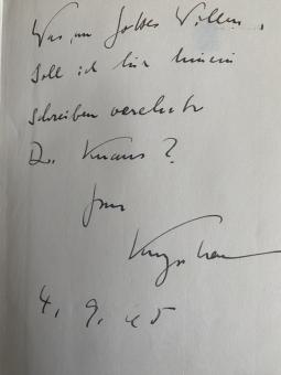 Auf dem fliegenden Vorsatz eine eigenhändige Widmung von Anton Graf Knyphausen an den Verleger Albrecht Knaus (1913-2007): "Was, um Gottes Willen, soll ich hier hinein schreiben verehrter Dr. Knaus? Ihr Knyphausen. 4.9.65".