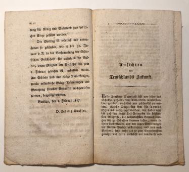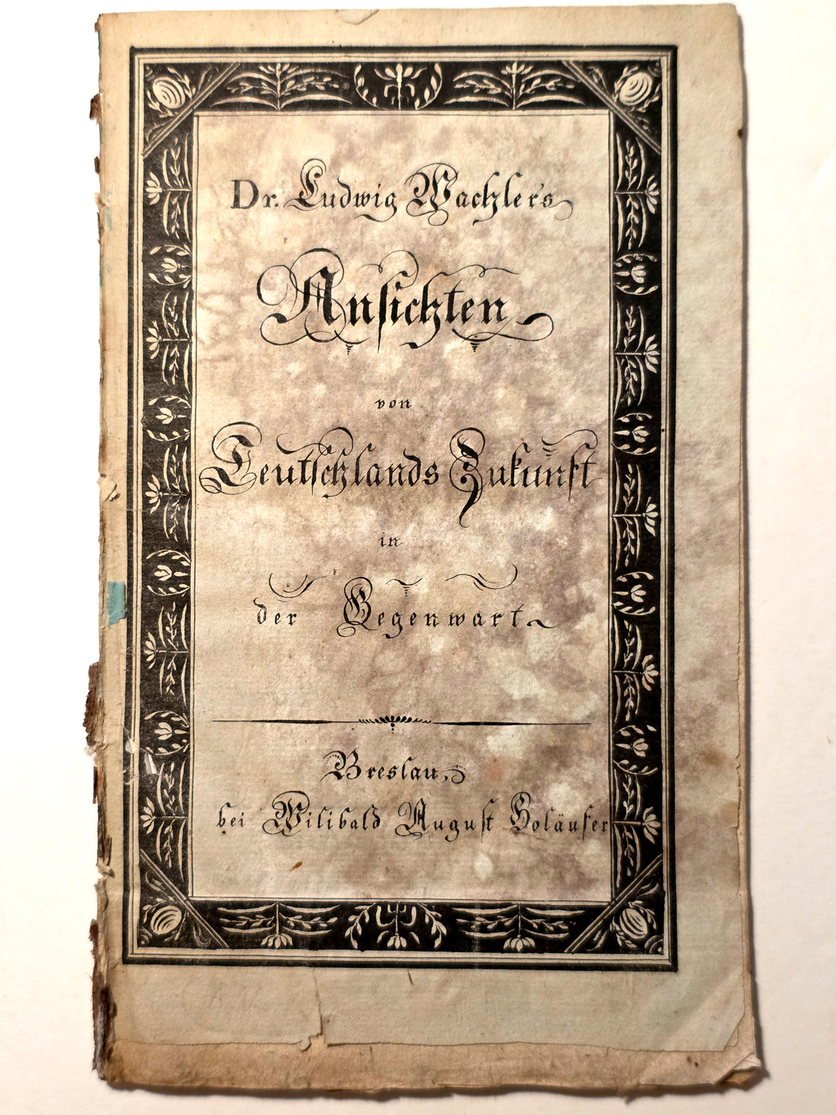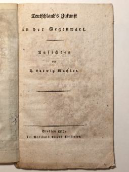 Erste und einzige Ausgabe dieser seltenen wirtschaflichen Utopie über Deutschlands Wirtschaft und Wohlergehen während der napoleonischen Besatzung. Einzige Ausgabe. "Für die wird geredet und geschrieben, welche im Weltgeräusche und im Gedränge der Berufsgeschäfte weniger gewahren von dem, was ein achtbarer Theil des vom besseren, menschlich-ehrwürdigen Zeitgeiste ergriffenen und bewegten Teutschen Volkes will und thut" (S. VIf.).